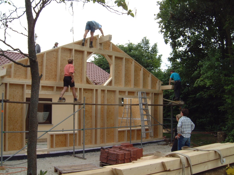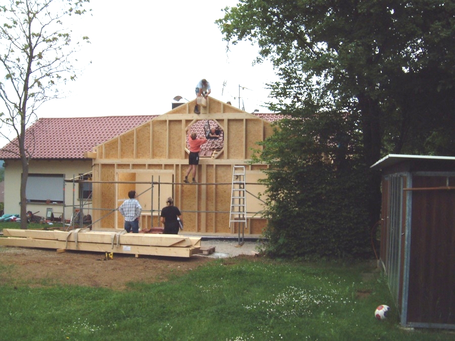 An das bestehende Wohnhaus wurde ein großzügiger Raum als Esszimmererweiterung angebaut. Dieser ca. 30 qm große Raum wurde mit Holzwandfertigteilen erstellt. Der Dachraum ist offen und über ein Rundfenster von oben zusätzlich belichtet.